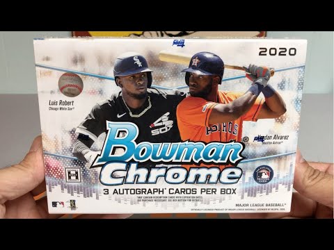 Each box of 2020 Bowman Chrome Baseball will deliver two autographs and one memorabilia card. The 200-card base set will feature170 veterans and 30 top prospects Look for rookies of Luis Robert, Salvador Perez, Randy Arozarena, Yordan Alvarez, Brendan McKay, Brennan Malone, and JJ Bleday.
