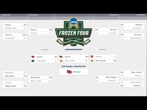 The Frozen Four is the semifinals and final of the NCAA Division I Men’s Ice Hockey Tournament, held annually in late March or early April. It features four teams: two from each of the NCAA’s two Division I Ice hockey only conferences, and two at-large teams.